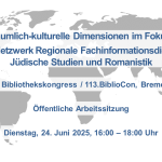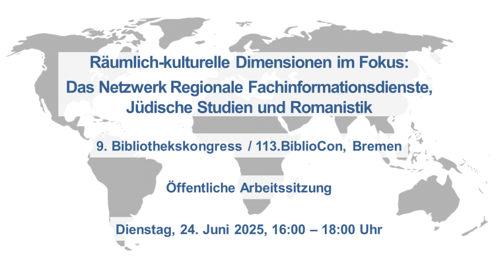 Wer sich dort über die Arbeit von gleich 11 Fachinformationsdiensten informieren und mit ihnen ins Gespräch kommen möchte, ist herzlich eingeladen, am kommenden Dienstag, 24.06.2025, von 16 Uhr bis 18 Uhr in den Lloyd Saal im 2. OG zur öffentlichen Arbeitssitzung des Netzwerks Regionale Fachinformationsdienste, Jüdische Studien und Romanistik zu kommen.