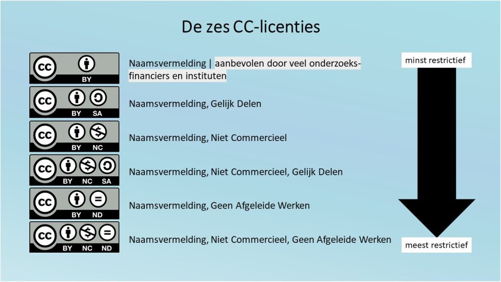 Je hebt in principe de keuze tussen zes verschillende licenties die gerangschikt zijn van minst restrictief (CC BY − Naamsvermelding) naar meest restrictief (CC BY NC ND – Naamsvermelding | Niet Commercieel | Geen Afgeleide Werken). Veel onderzoeksfinanciers en instituten bevelen CC BY aan voor onderzoeksdata. Andere CC-licenties met restricties (zoals Niet Commercieel of Geen Afgeleide Werken) kunnen de herbruikbaarheid beperken en zijn daarom minder ideaal vanuit een strikt FAIR-perspectief, hoewel ze soms noodzakelijk kunnen zijn afhankelijk van de aard van je eigen data of van de data die je hebt verwerkt. Daarnaast bestaat er ook CC0. CC0 is geen echte licentie, maar betekent dat je als auteursrechthebbende afstand doet van alle auteursrechten.